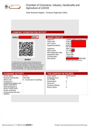 La visura camerale in inglese riporta le stesse informazioni della visura camerale ordinaria italiana, tradotte ufficialmente: