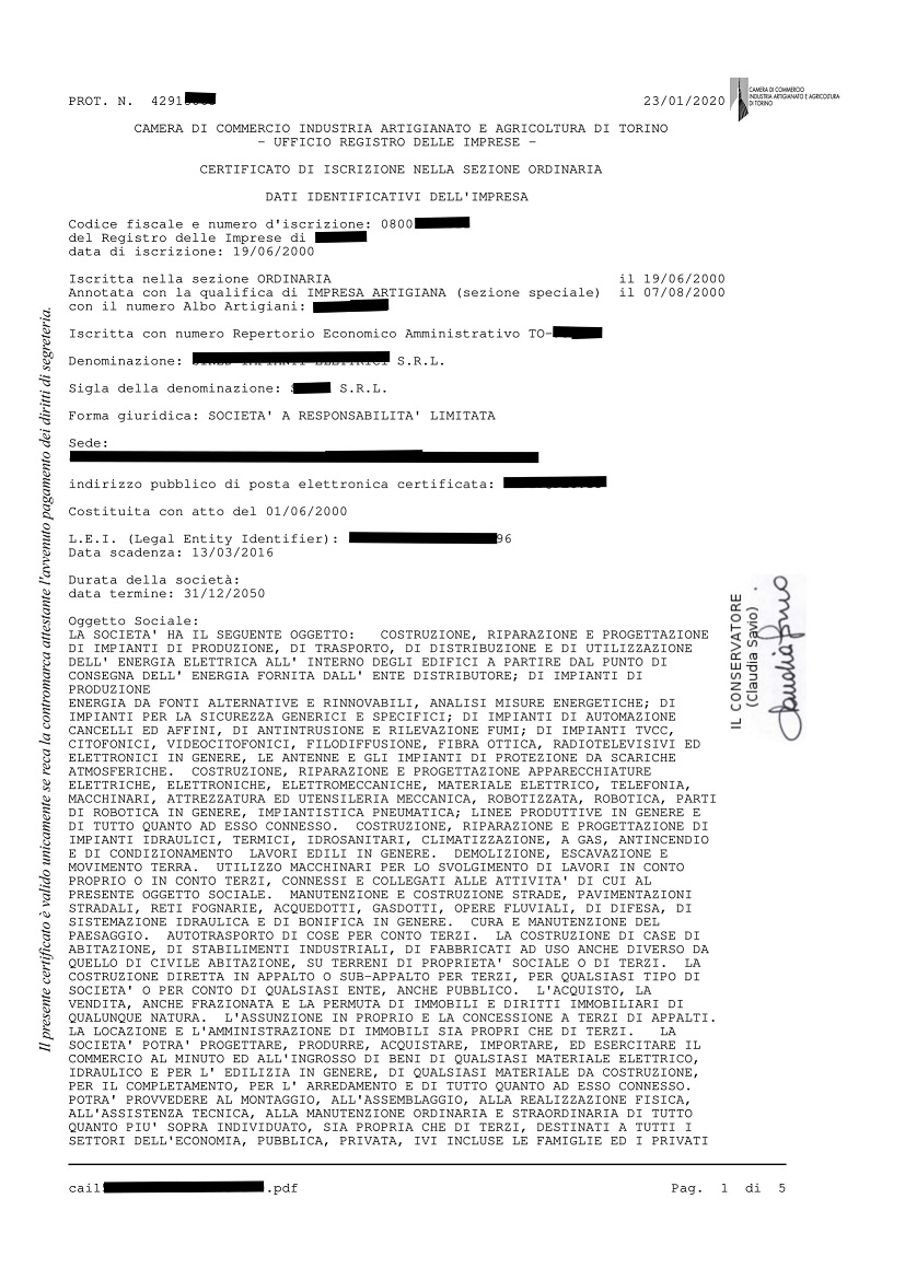 - Riferimenti d’iscrizione: numero REA, data iscrizione al Registro Imprese