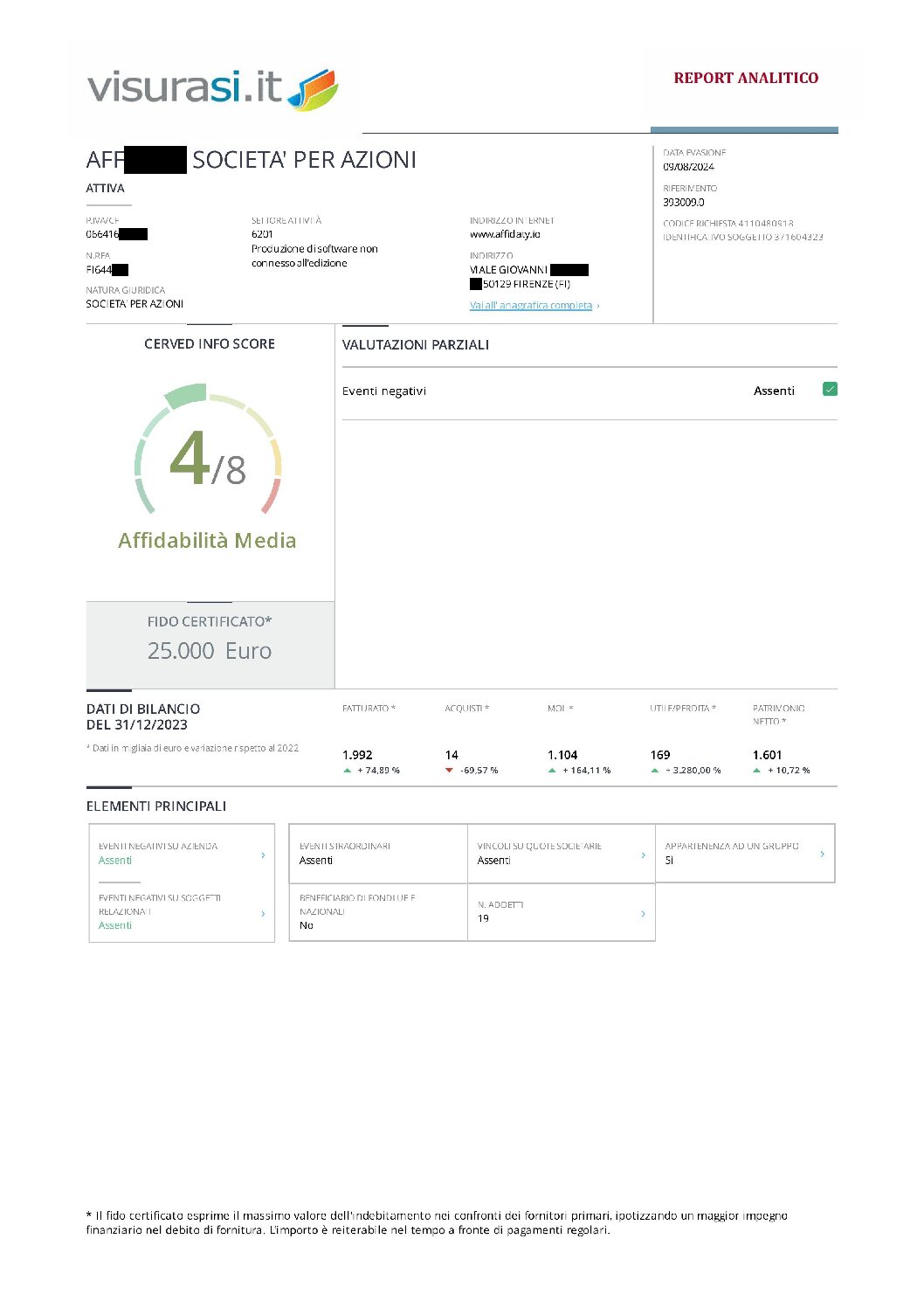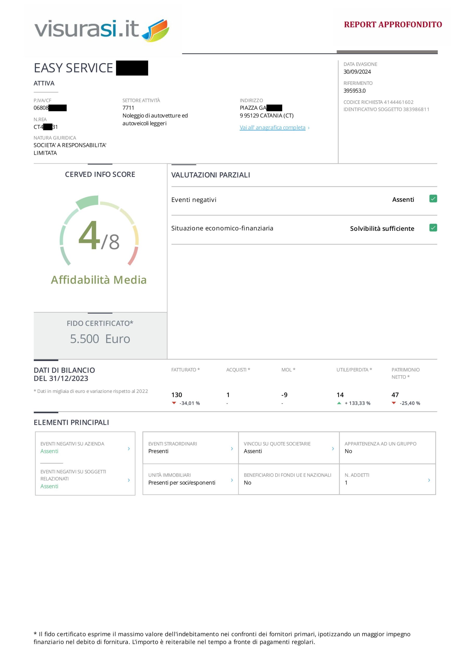 Il report include il Cerved Info Score, il sistema di rating più utilizzato in Italia per la valutazione dell’affidabilità commerciale delle imprese, e un fido suggerito che indica l’importo di credito consigliato sulla base dell’analisi complessiva dei dati.