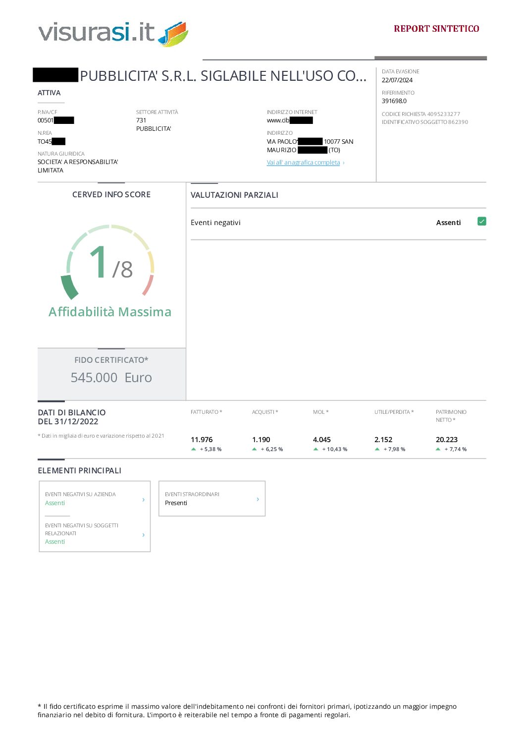 È un documento di analisi economico-finanziaria che aggrega in un unico report tutte le informazioni rilevanti su un’impresa italiana: rating (Cerved Info Score), fido suggerito, sintesi bilancio, protesti, pregiudizievoli, procedure concorsuali, management, soci, imprese connesse, profilo operativo. Disponibile in 3 livelli: Sintetico, Analitico e Approfondito.