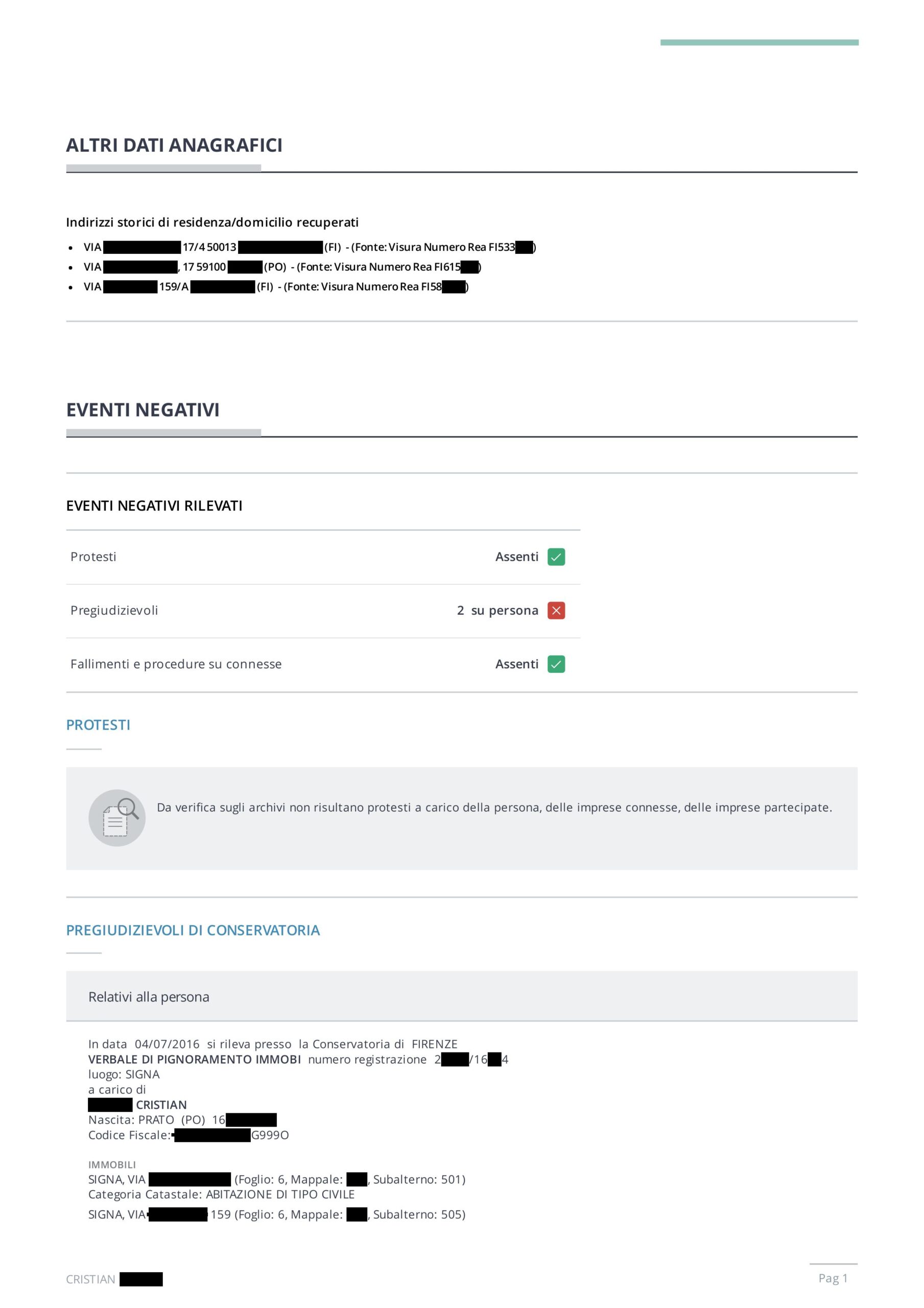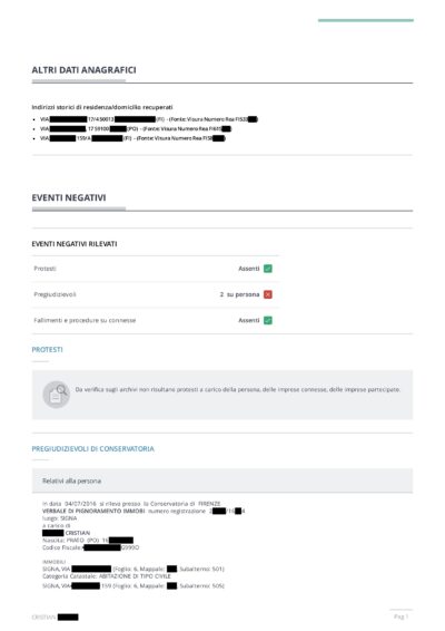 È un documento di analisi che aggrega in un unico report le informazioni economico-finanziarie di una persona fisica da fonti ufficiali e pubbliche: protesti, pregiudizievoli (ipoteche giudiziali, pignoramenti, sequestri), procedure concorsuali, cariche societarie, partecipazioni e iscrizioni professionali. Include un Indicatore di Valutazione Statistica dell’affidabilità del soggetto.