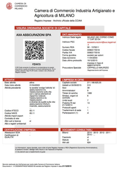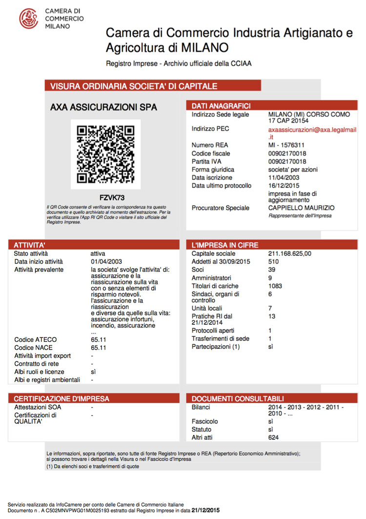 Il nostro servizio ti permette di acquistare la visura camerale ordinaria o storica direttamente online, 24 ore su 24, 7 giorni su 7. Documento ufficiale della Camera di Commercio (CCIAA), completo di QR Code per la verifica di autenticità.