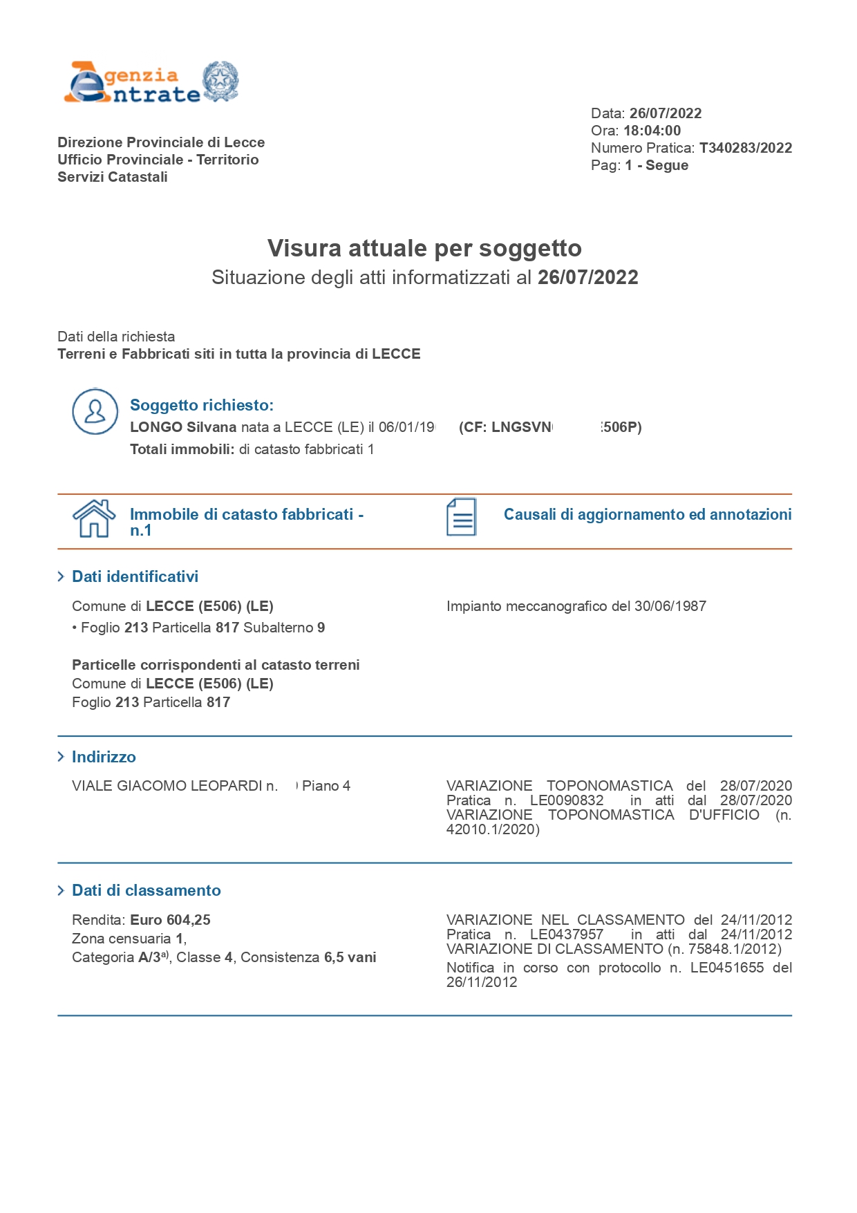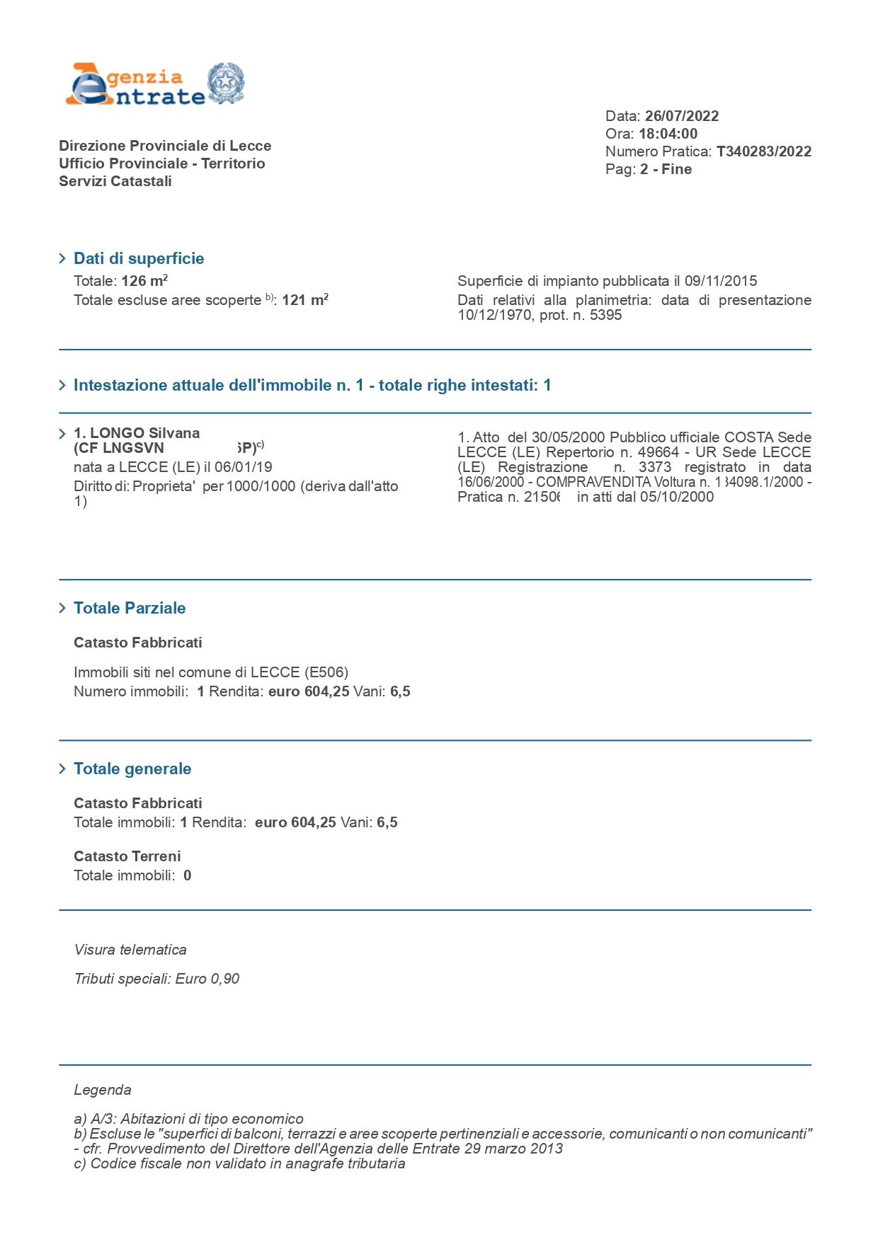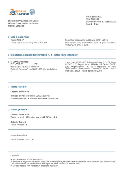 Il documento restituisce le stesse informazioni della visura catastale per codice fiscale. Per ogni immobile (fabbricato o terreno) intestato alla persona: