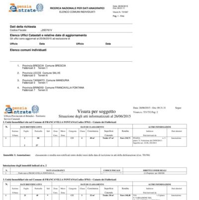 Ricevi una visura PDF per ogni provincia in cui il soggetto risulta intestatario di immobili. Il numero dipende dalla distribuzione del patrimonio: potrebbe essere una sola provincia o diverse. Tutte le visure sono incluse nella stessa richiesta.